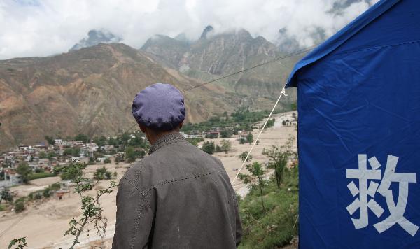 8月19日,在隍庙山受灾群众安置点,一位老人久久凝望着月圆村所在的地方。