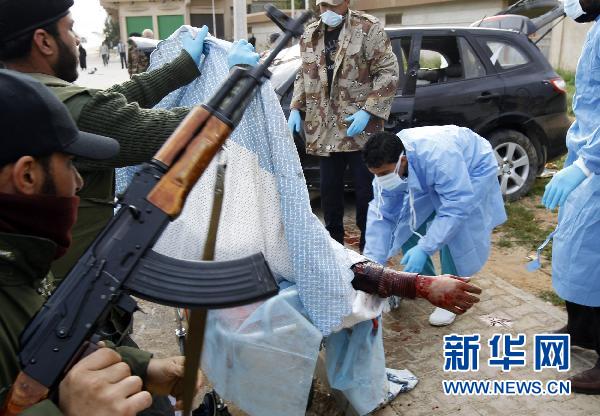 3月19日,在利比亚城市班加西,医护人员在为一名政府军士兵处理伤情。据利比亚电视台当日报道,班加西市的居民已经把反政府武装人员从该市三分之二的区域赶跑。当地居民在市中心的刑事法院办公大楼升起了利比亚国旗。新华社/路透