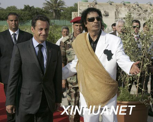 2007年7月萨科奇访问利比亚,受到卡扎菲亲切接待。当时,萨科奇在外访中,积极向利比亚等国推销“阵风”战斗机等军火。(新华网图片)