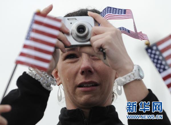 3月23日,在美国弗吉尼亚州诺福克海军基地,一名女子目送“巴丹岛”号两栖攻击舰离港。新华社记者张军摄