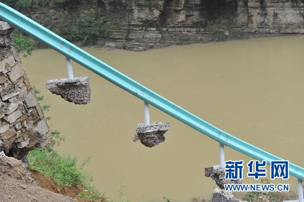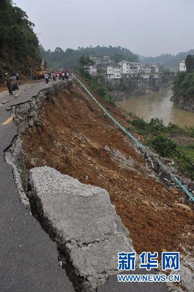 6月21日,贵州省遵义市正安县内的207省道K110处出现长达105米的塌方,部分路面滑入旁边的芙蓉江中。 新华社记者欧东衢摄