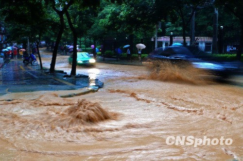 2010年6月18日,连日暴雨造成福建南平城区部分地段内涝和塌方,给商家、市民和公共设施造成重大损失,也给市民出行带来了困难。 中新社发 王商林 摄