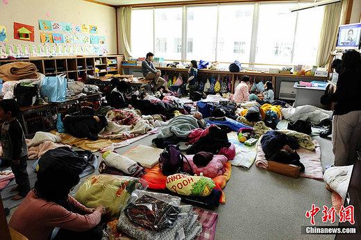 3月13日,中新社记者驱车约12小时,抵达接近日本东北大地震震区的福岛县郡山市。图为日本福岛县田村市船引避难所的情况。中新社记者 侯宇 摄