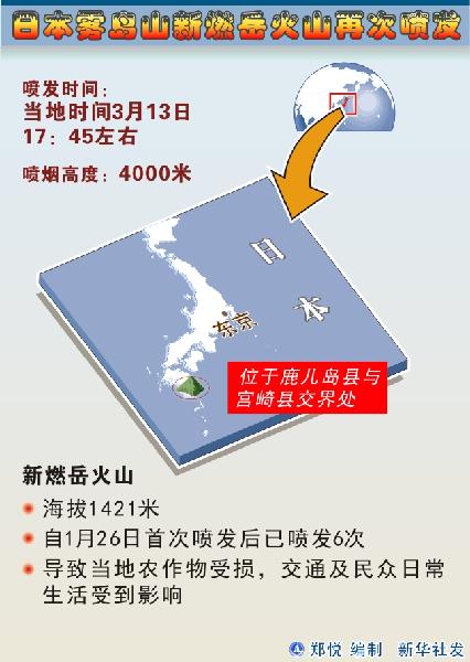 日本雾岛山新燃岳火山再次喷发 喷烟高度达4000米