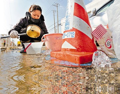 日本灾区食品、饮用水严重短缺,图为宫城县一名灾民在街上出水口盛水。
