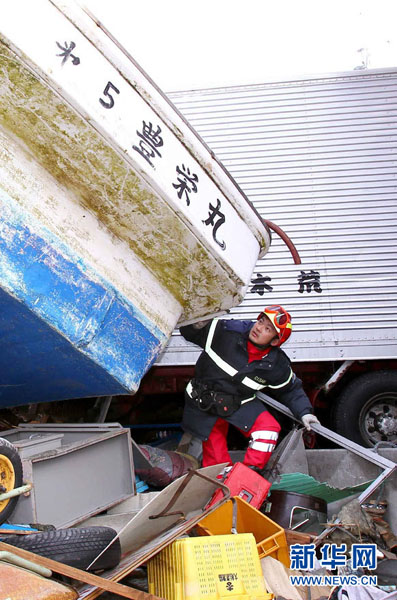 3月16日,在日本宫城县大船渡市重灾区,一名中国国际救援队队员在被海啸冲到居民住宅区的渔船周围排查。3月11日,日本东部海域发生9级强烈地震,并引发巨大海啸,造成严重人员伤亡和巨大财产损失。中国政府在第一时间做出反应,向日本派出中国国际救援队,并提供紧急救灾物资等。 新华社记者陈建力摄