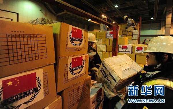 3月28日晚,在日本东京成田机场,工作人员搬运来自中国的救援物资。当晚,中国援助日本的第二批救援物资运抵日本成田机场。此批物资包括6万瓶矿泉水和325万副橡胶手套,共计96吨、473立方米,将迅即运往茨城县等地震灾区。新华社记者 季春鹏 摄