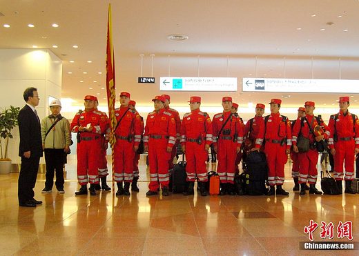 3月13日中午12:20分,中国国际救援队抵达东京羽田国际机场,随后赶往重灾区。救援队15名队员均有丰富的国内外救灾经验。图为日本外务省副大臣伴野丰在机场迎接救援队。谢国桥 摄