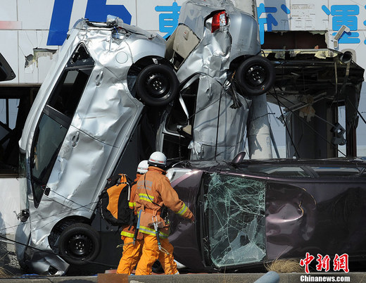 北京时间3月11日13点46分,日本本州岛附近海域发生里氏9.0级地震,震中位于宫城县以东太平洋海域,震源深度10公里,东京有强烈震感。图为13日,仙台市两名救援人员走过被地震损毁的汽车。