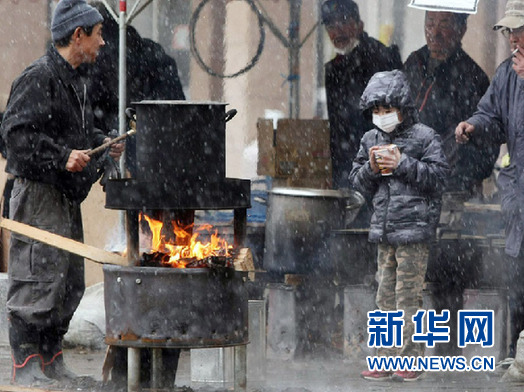 3月16日,日本宫城县仙台市,一个男孩在雪中等候开水泡面。从15日夜间开始,强冷空气袭击日本地震灾区,大部分地区降起了大雪。由于灾区大部分地区断电,有近2000个避难场所没有空调,此外燃油短缺,煤油取暖器无法使用。加上毛毯不足,灾民生活情形十分的困难。