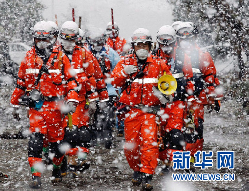 日本仙台,搜救队员在雪中行进。