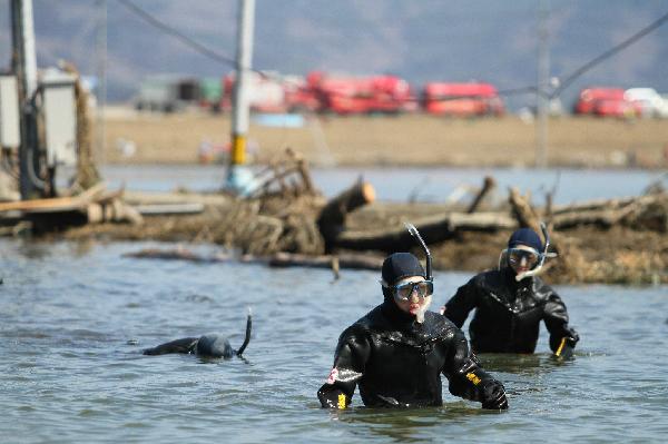 4月1日,搜救人员在日本宫城县被海水淹没的稻田里搜索遇难者的遗体。日本警察厅2日宣布,截至当天10时,日本东北部海域发生的强震及其引发的海啸已确认造成11800人死亡,15540人失踪。 新华社/法新