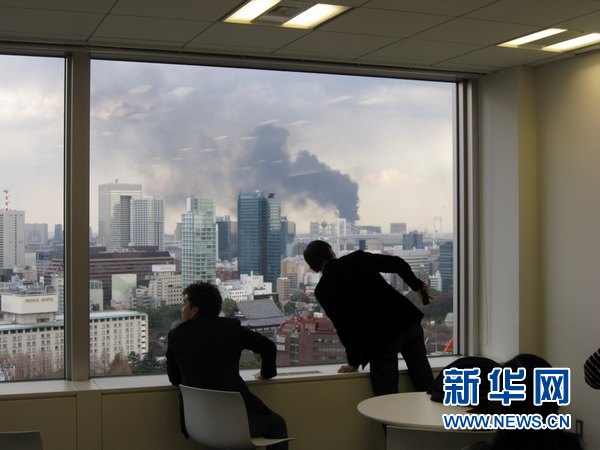 3月11日,东京湾彩虹桥附近在地震后起火。据中国地震台网中心网站消息,日本本州东海岸附近海域,北京时间11日13时46分,发生里氏8.6级地震,震源深度20公里。新华社记者冯武勇摄