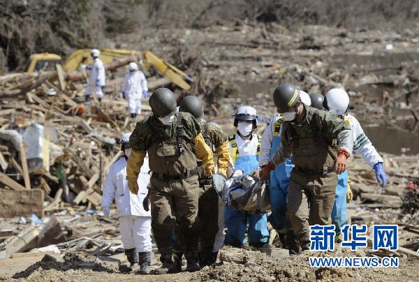 在日本宫城县的石卷,日本自卫队队员搬运一名遇难者遗体(摄于4月1日)。日本自卫队和美军当日结束了对日本大地震及海啸失踪者的大规模搜索行动,一共搜寻到77名遇难者遗体。据日本广播协会电视台报道,日本自卫队和美军1日开始大规模搜索日本东北部海域地震及海啸中的失踪者,3天的搜索行动中共出动了120架飞机、60艘舰艇和2.5万名官兵,日本海上保安厅、警方和消防部门也参与了搜索行动。新华社/共同社