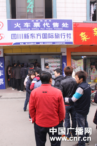 在成都郫县犀浦镇上的火车票代售点,人们排长队买票