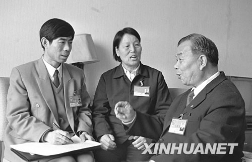 1994年3月18日,出席八届全国人大二次会议的全国人大代表申纪兰(中)、李双良(右)、亢龙田(左)在一起商讨为贫困山区修路的问题(资料图片)。 新华社发