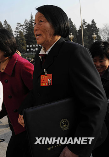 这是2008年3月5日,申纪兰代表走向人民大会堂,出席十一届全国人大一次会议开幕会(资料图片)。 新华社发
