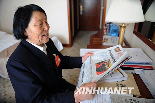 这是2008年3月7日,全国人大代表申纪兰在驻地阅读关于两会的报道(资料图片)。 新华社发