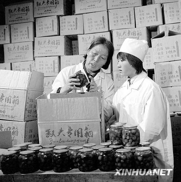 申纪兰带领群众脱贫致富,1986年9月与县供销社联合办起一座罐头厂,投产后的第一个月就生产红果、梨罐头5万多瓶。这是申纪兰(左)和工人一起检查罐头质量(资料照片)。 新华社发