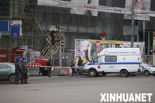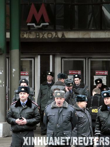 3月29日,在俄罗斯首都莫斯科,内政部官员在卢比扬卡地铁站入口工作。卢比扬卡地铁站29日发生爆炸,已经造成至少25人死亡。 莫斯科另一个地铁站随后也发生爆炸,造成至少11人死亡,12人受伤。新华社/路透