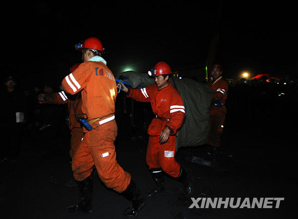 4月5日,救援人员将一名获救矿工抬出井口。当日,华晋焦煤王家岭矿“3·28”透水事故首批获救矿工升井,被急救车送往医院救治。目前现场救援工作仍在进行。 新华社记者 燕雁 摄