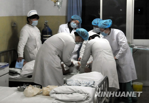 当日凌晨,王家岭矿透水事故首批获救的9名工人被陆续送至山西铝厂职工医院接受检查和治疗。在9名获救工人中,有4人的生命体征平稳,意识清醒。医务人员正有条不紊地对获救工人进行治疗。新华社记者 吕晓宇 摄