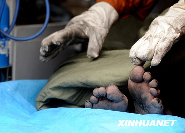 4月5日,救援人员将获救矿工抬向救护车。当日,华晋焦煤王家岭矿“3·28”透水事故第二批获救矿工陆续升井。现场救援人员预计生还者可以突破100人。 新华社记者 燕雁 摄