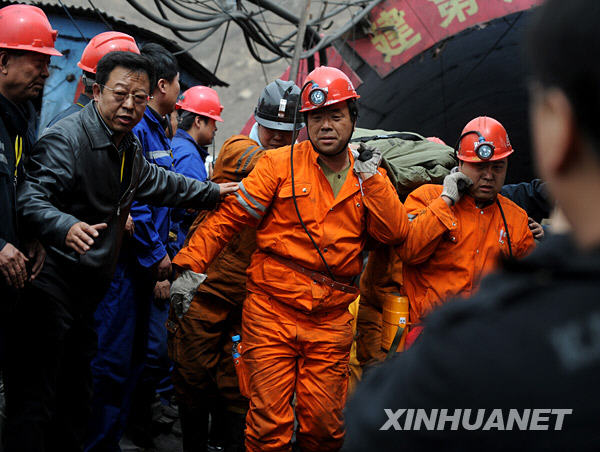 4月5日,救援人员将获救矿工抬出井口。当日,华晋焦煤王家岭矿“3·28”透水事故第二批获救矿工陆续升井。现场救援人员预计生还者可以突破100人。新华社记者 燕雁 摄