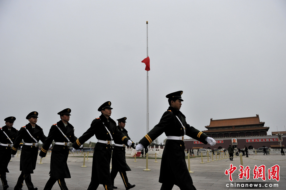 4月21日早晨,北京天安门广场下半旗为玉树地震遇难者志哀。中新网记者 金硕 摄