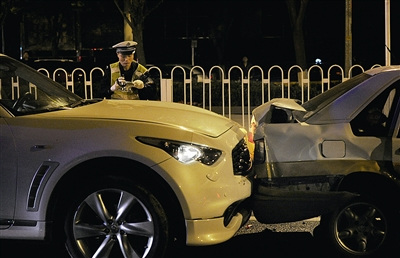 交警在现场勘察事故,白色英菲尼迪为高晓松座驾