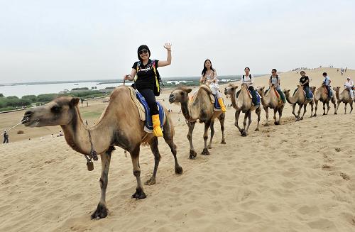 7月9日,游客骑骆驼在沙湖景区游玩。随着夏季到来,宁夏沙湖、沙坡头等沙漠旅游胜地迎来旅游高峰,来自全国各地的游客顶着烈日感受沙漠旅游的独特魅力。新华社记者 王鹏 摄