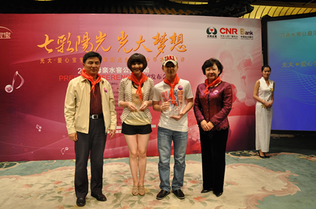 央广都市传媒有限公司董事长陶炜与光大银行信用卡中心总经理戴兵以及本次活动形象大使——著名影视明星蒋小涵、童星阿尔法合影