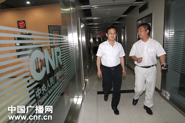 中央人民广播电台副台长王晓晖陪同铁道部新闻发言人王勇平参观直播区