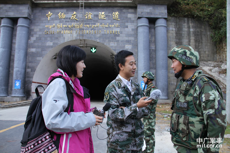 中央台记者王娴、孙杰在中缅友谊隧道前采访执勤边防官兵。(中广军事记者刘鹏摄)