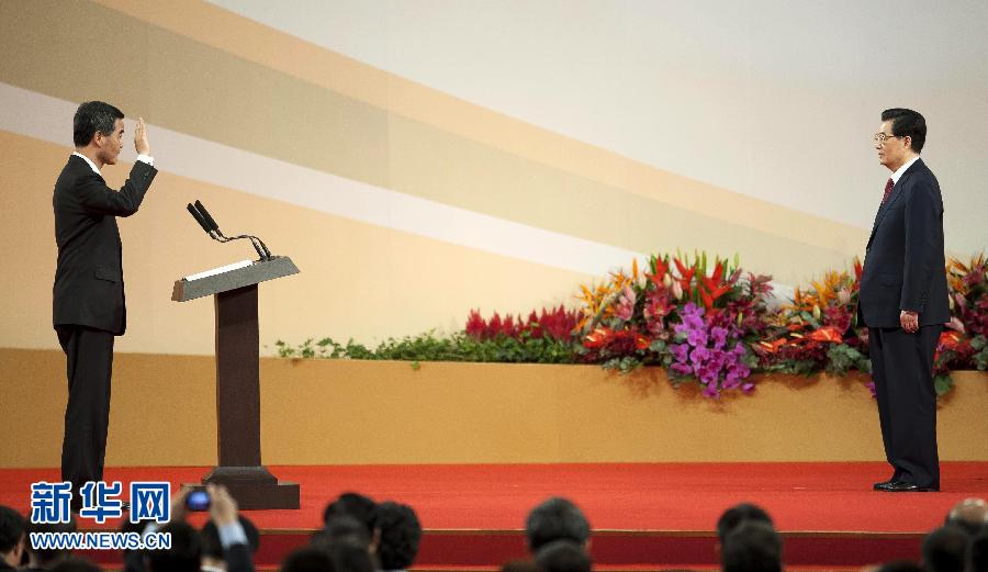 7月1日,中共中央总书记、国家主席、中央军委主席胡锦涛出席庆祝香港回归祖国15周年大会暨香港特别行政区第四届政府就职典礼。这是由胡锦涛监誓,香港特别行政区第四任行政长官梁振英宣誓就职。新华社记者吕小炜摄