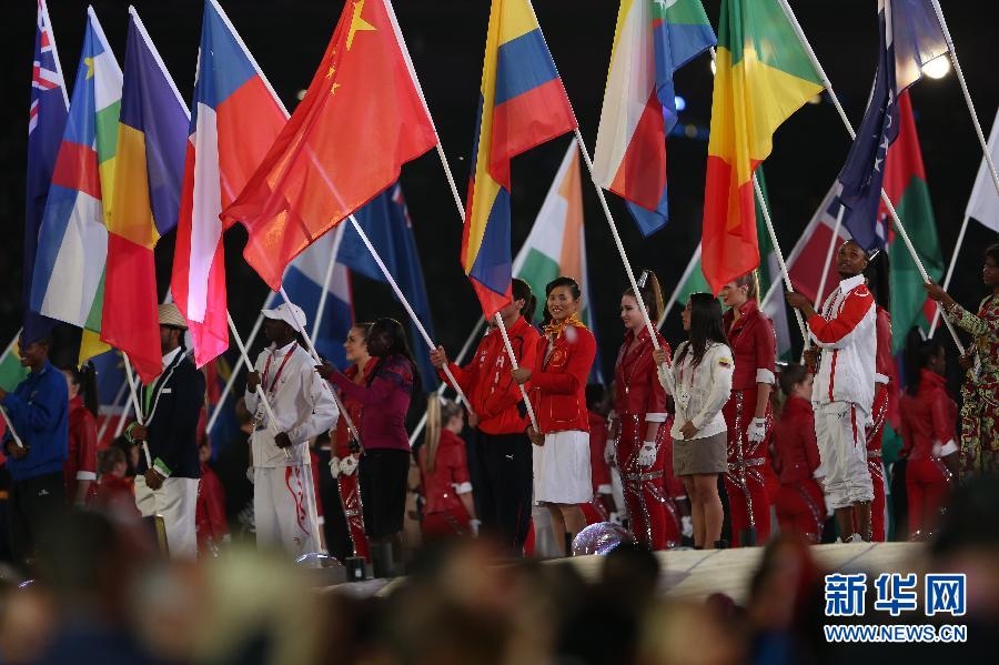 8月12日,第30届夏季奥林匹克运动会闭幕式在伦敦奥林匹克体育场举行。这是中国代表团旗手、奥运会女子激光雷迪尔级冠军徐莉佳(中)在闭幕式上手举五星红旗入场。新华社记者金立旺摄