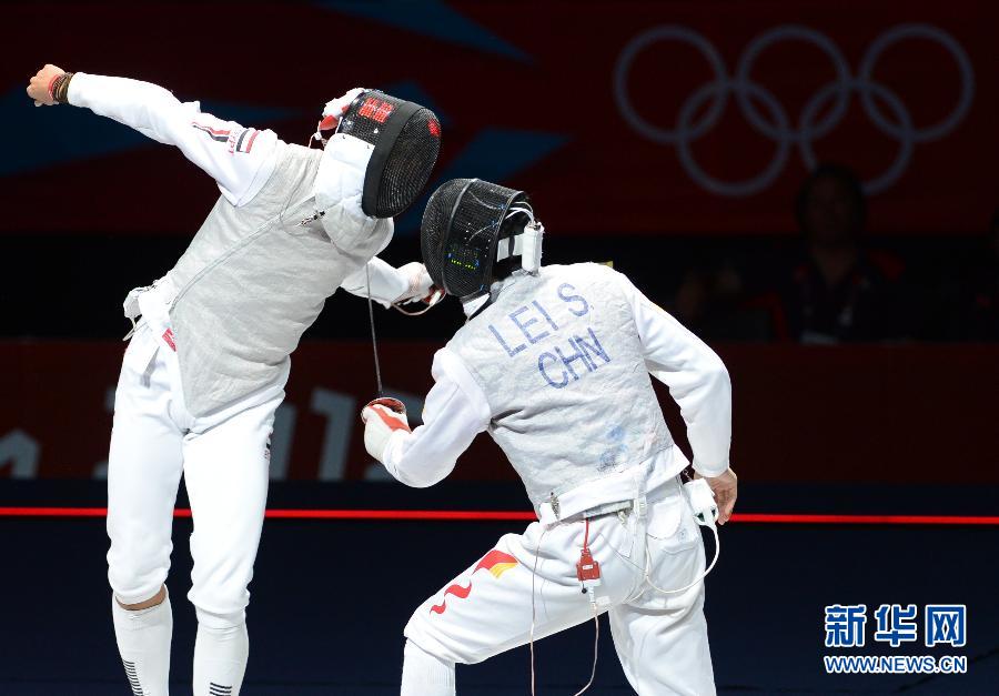 7月31日,中国选手雷声(右)在比赛中。当日,在伦敦奥运会击剑男子花剑个人决赛中,中国选手雷声击败埃及选手阿布卡西姆,夺得金牌。 新华社记者 曾毅 摄