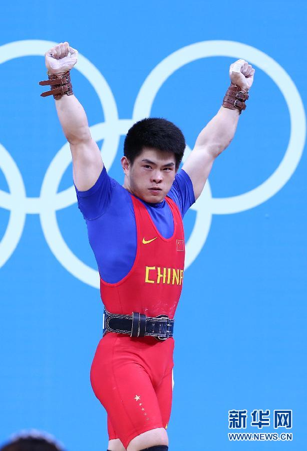 7月31日,中国选手林清峰在赛后庆祝。当日,在伦敦奥运会举重男子69公斤级比赛中,中国选手林清峰以344公斤的总成绩夺得冠军。 新华社记者 陈建力 摄