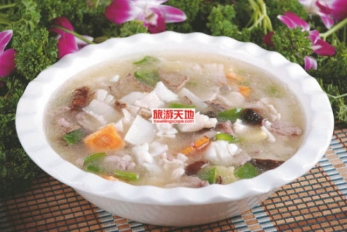 要是想美味升级就来一碗“糁”。 “糁”又名“肉粥”,其主要原料是母鸡肉(或牛、羊肉)和麦米、面粉,辅以葱、姜、盐、酱油、胡椒粉、味精、五香粉、香油、醋等佐料,工艺精细复杂,早餐营养更全面了。
