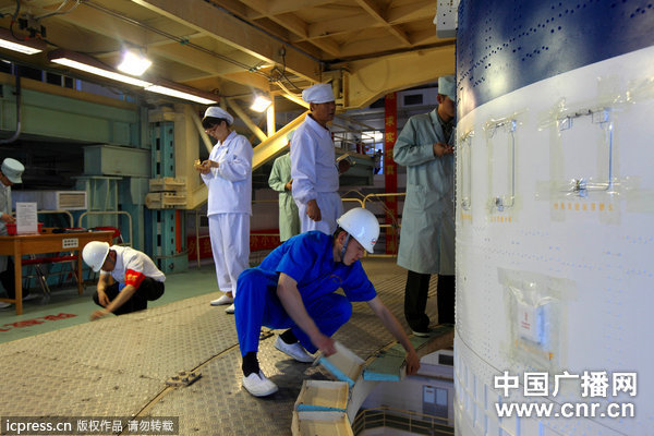 2012年6月8日,神舟九号飞船火箭完成总装测试厂后即将转往发射区。图为工作人员对火箭进行最后的状态检查。(许海晗/东方IC)