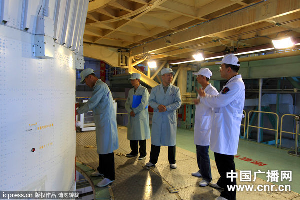 2012年6月8日,神舟九号飞船火箭完成总装测试厂后即将转往发射区。图为工作人员对火箭进行最后的状态检查。(许海晗/东方IC)