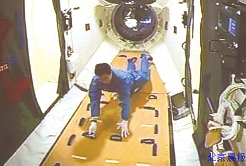 在昨天的电视画面中,天宫一号内的摄像头对准了实验舱的舱门,随着景海鹏推开圆形白色的舱门,并首先露出了头部,北京的飞控现场传来了激动的掌声。景海鹏眼前的“新家”俨然宽敞了许多,白色的舱壁颇为温馨,卧室的绿色隔布上还挂着大大的中国结,一面挂在墙上的五星红旗格外抢眼。景海鹏进入后的第一次行走还有些不适应,一不小心就飞起来,之后在手脚限位器的帮助下,走得开始稳健。据了解,手脚限位器也是天宫里最多的一种设备。“已经进入了目标飞行器,感觉良好。天宫一号舱内环境正常,神舟九号状态良好。”景海鹏通过天宫一号里的设备和地面进行了通话。
