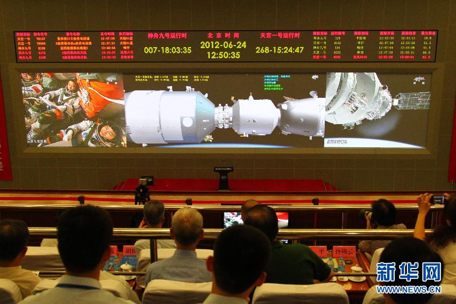 6月24日拍摄的北京航天飞控中心大屏幕显示,神舟九号飞船与天宫一号手控对接成功。 新华社记者 查春明 摄