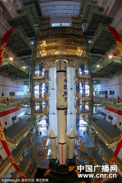 2012年6月8日,神舟九号飞船火箭完成总装测试厂后即将转往发射区。图为撤收部分平台的船箭组合体。(许海晗/东方IC)