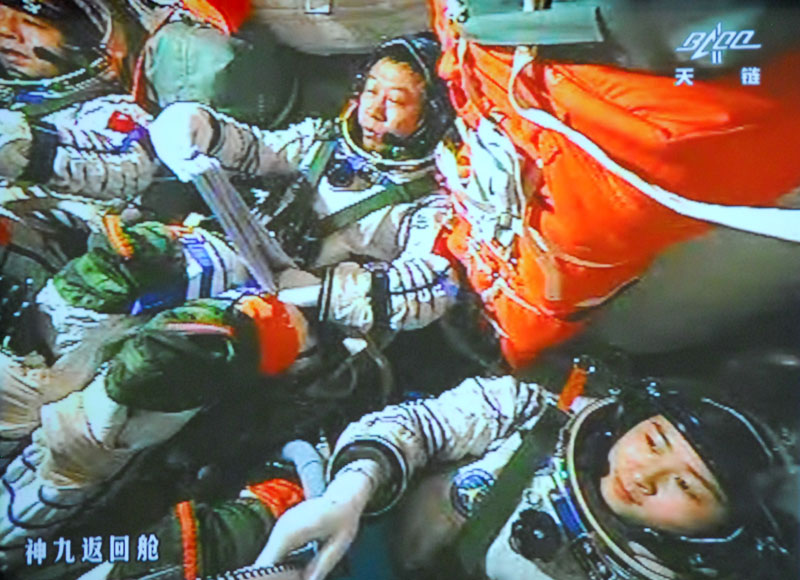 图为三位航天员已经做好进行手动对接的准备。新华网 翟子赫 摄