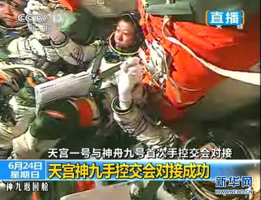 6月24日从电视屏幕截取的画面显示,神舟九号与天宫一号再次形成组合体,首次手控交会对接成功。 新华社发