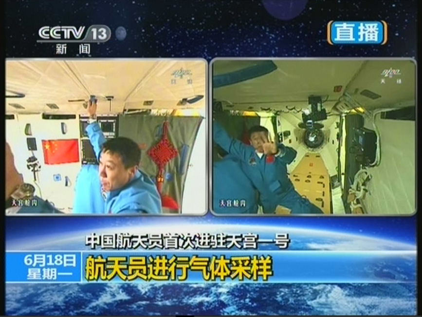 中广网快讯 景海鹏和刘旺一个在做气体采样准备,一个在做天宫一号各项状态检查,二人将脚固定在限位期内,紧密配合工作。