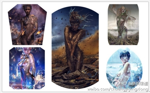 对于陈漫众多的作品,她个人比较喜欢《五行系列》,这个系列有五组图片 ,金、木、水、火 土,每一组有两张图片,一张是使用职业模特加夸张后期合成的魔幻超现实画面,另外一张是源自生活中的真实人物的纪实照片。超现实画面中所有模特都是半裸着身体,演绎着一个个被幻化的角色。有被金属外壳束缚双手放在背后接近窒息的金女子;有在枯木中伸展身体稀疏发丝张狂飞舞的秃顶木女子;有四周冰川环抱却被阳光烤照的水女子;有在硝烟滚滚中走来,遍体鳞伤的火女子;还有在黄沙漫天从土中钻出被白色垃圾缠绕的土女子。陈漫为我们讲解到,比如说像水的那个就是要表现出全球变暖,虽然画面很美,但是里面有很多的危机存在。与超现实画面相配的现实角色,陈漫也做了细心的安排,水对应的角色是卖海鲜鱼类的妇女,木对应的是锯木头的女工,金对应的是一位正在数钞票的大姐。这些现实中的人物有不同的职业。但在画面中,她们都是一个狂笑的状态。陈漫说这种超写实的东西正是对现状的阐述,对于现在人类浮躁思想,对于物质文化的需求,对于膨胀的欲望现实的记录。