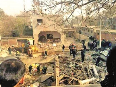 昨日早上8点多,安阳市安东新区高庄乡朱家营村一鞭炮厂发生爆炸,三层楼几乎被炸平,包括作坊主在內至少6人被埋废墟中,十几辆消防车赶到现场救援,外围已拉起警戒线。记者从有关部门获悉,爆炸造成5人死亡2人受伤,伤者已送至医院抢救。