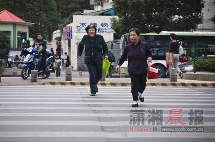 长沙市雨花亭小学门口,由于绿灯时间比较短,老人需要慢跑才能过马路。